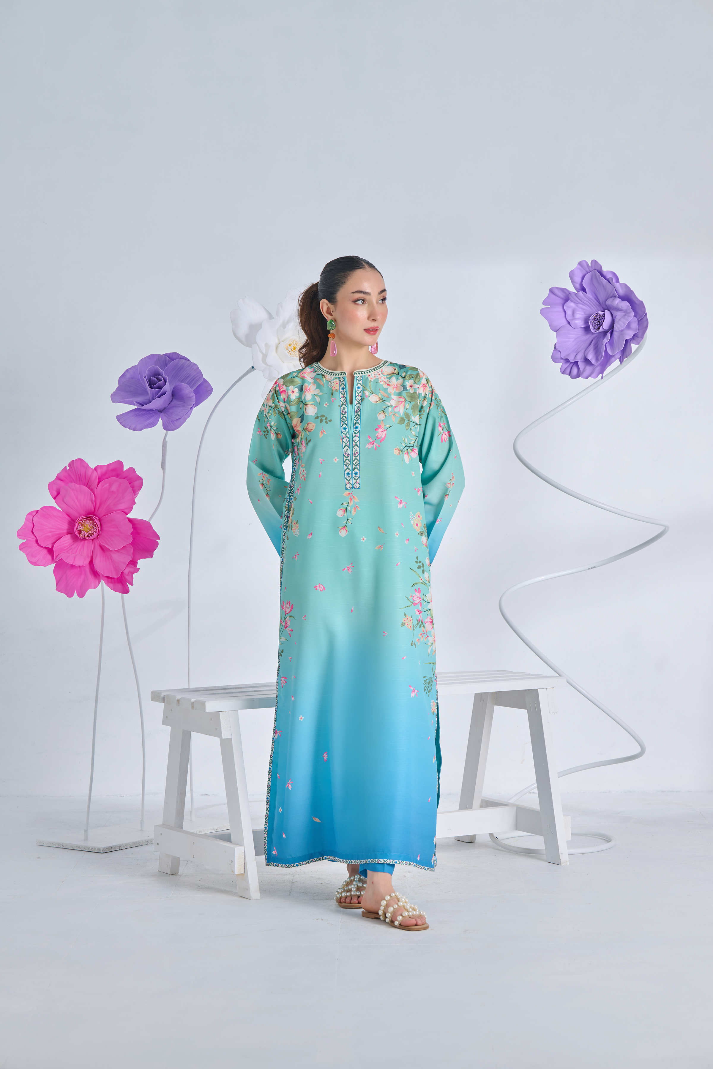 The Bloom Kaftan 2-Piece Set is a perfect blend of grace and vibrance, crafted from luxurious winters fabric to bring elegance to every occasion. Its deep Dark Jungle Green base is beautifully enhanced with lively multi-colour floral digital prints, adding a fresh and radiant touch to your style. Designed with a regular-fit silhouette, the kaftan drapes effortlessly for both comfort and sophistication, while the matching trouser completes the look with refined charm. Ideal for festive gatherings, evening outings, or chic daytime wear, the Bloom Kaftan makes every moment feel effortlessly stylish.