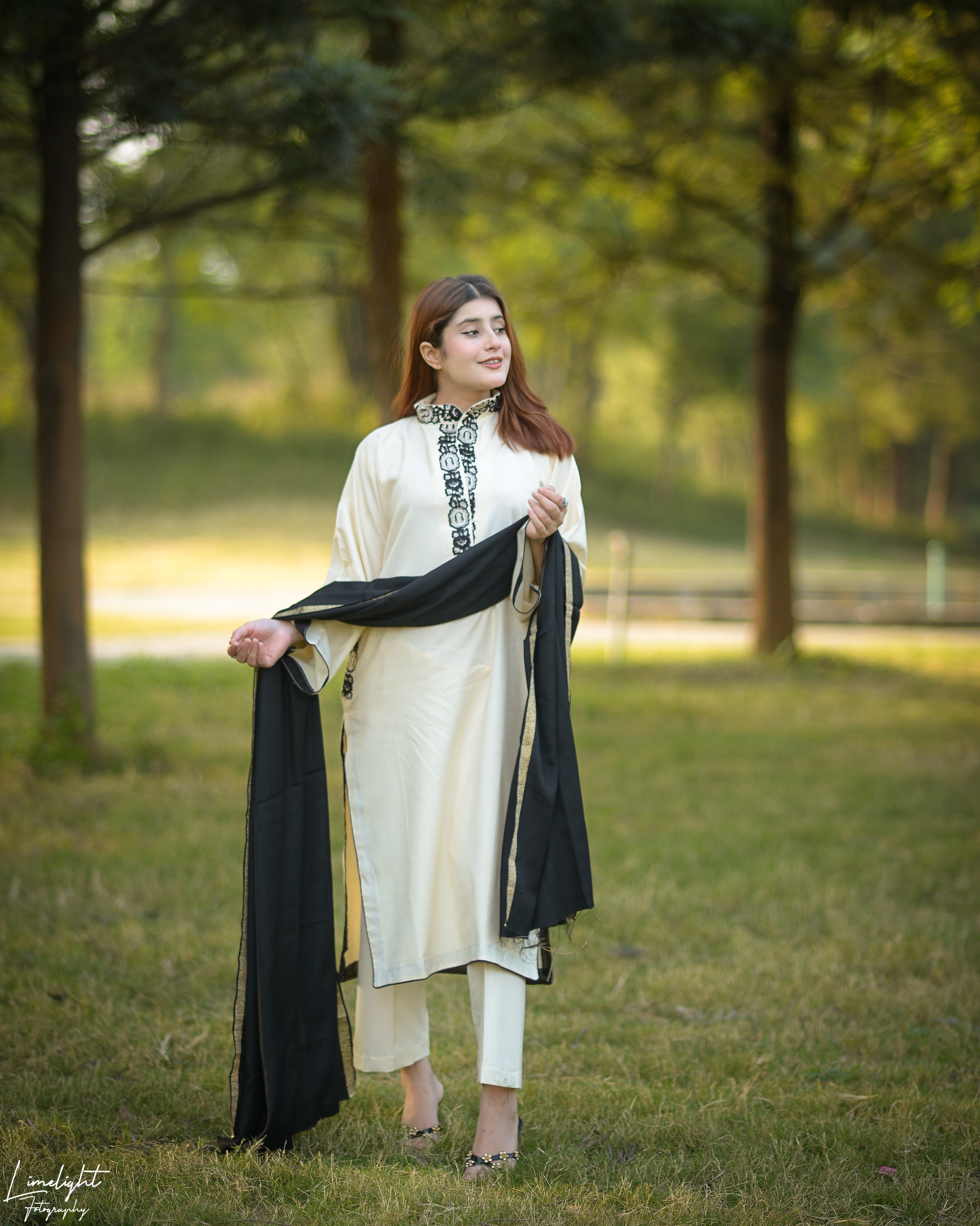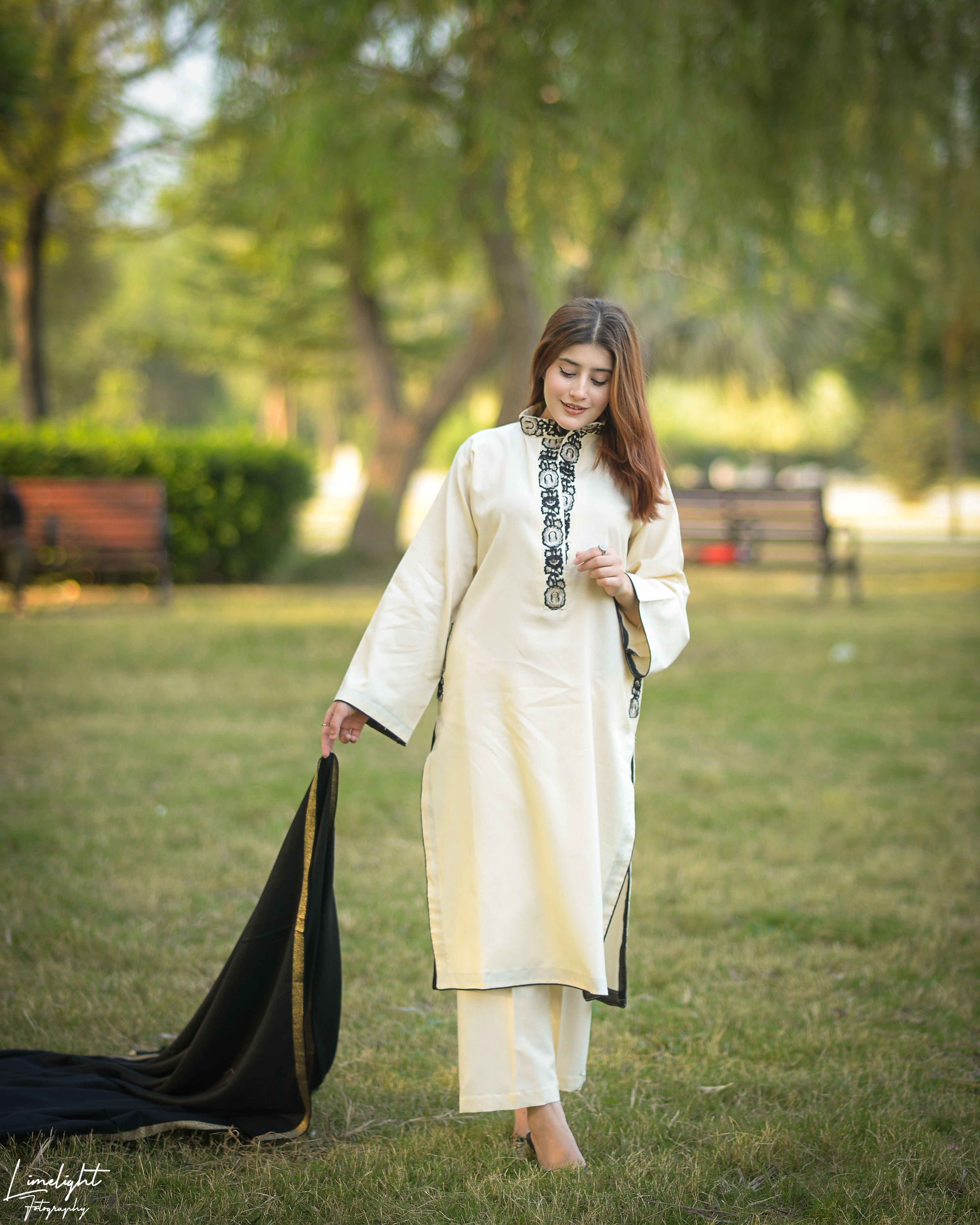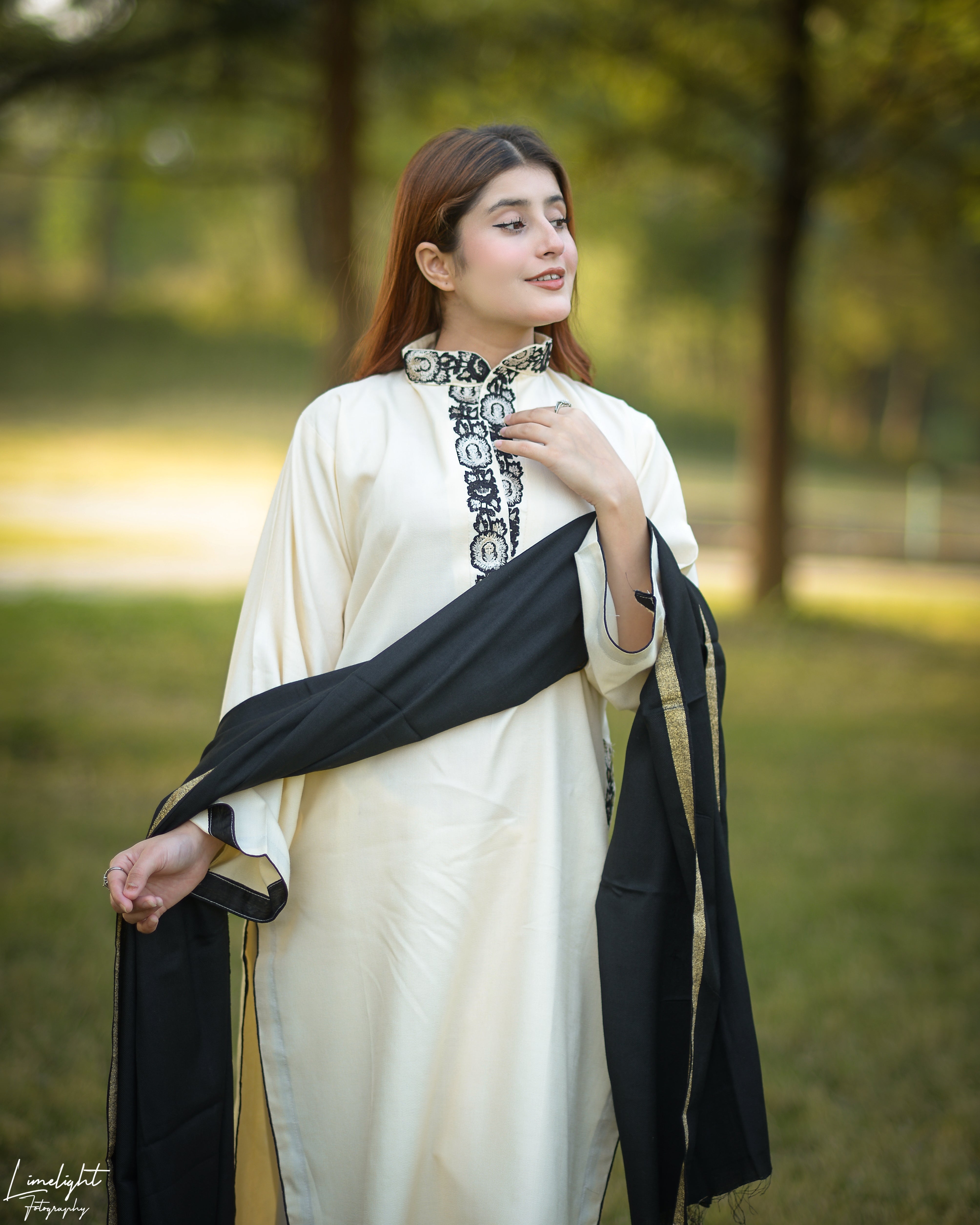 Hanna Embroidered 3-Piece Winter Ensemble combines elegance with comfort, offering a timeless look for the chilly season. Designed in a soft cream tone, the straight-cut kurta is beautifully detailed with delicate floral embroidery on the neckline and pocket, enhanced by lace accents on the front and sleeves for a chic winter touch. Paired with matching straight trousers for a refined silhouette, the outfit is completed with a luxurious black pashmina shawl that adds warmth and contrast.