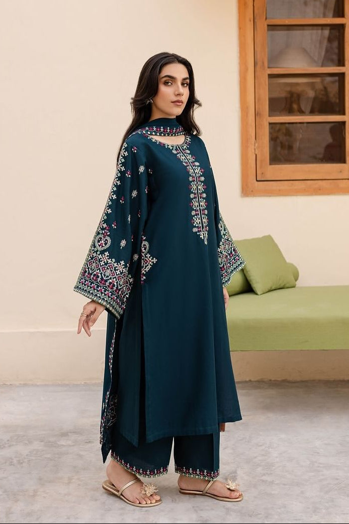 Upgrade your wardrobe with this stunning embroidered lawn 3-piece suit in a rich deep teal shade. Designed for comfort and style, this premium lawn outfit for women features detailed multicolored embroidery on the neckline, sleeves, and borders—perfect for creating an elegant and timeless look.
